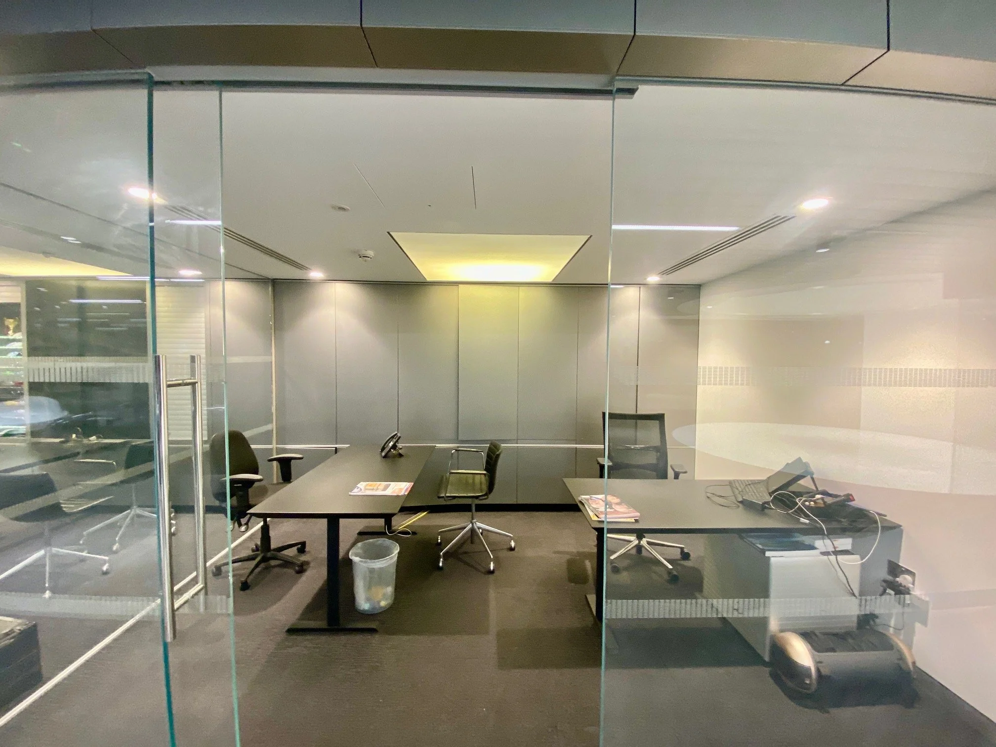 Frameless glass partition system with privacy film across a full office fit out.